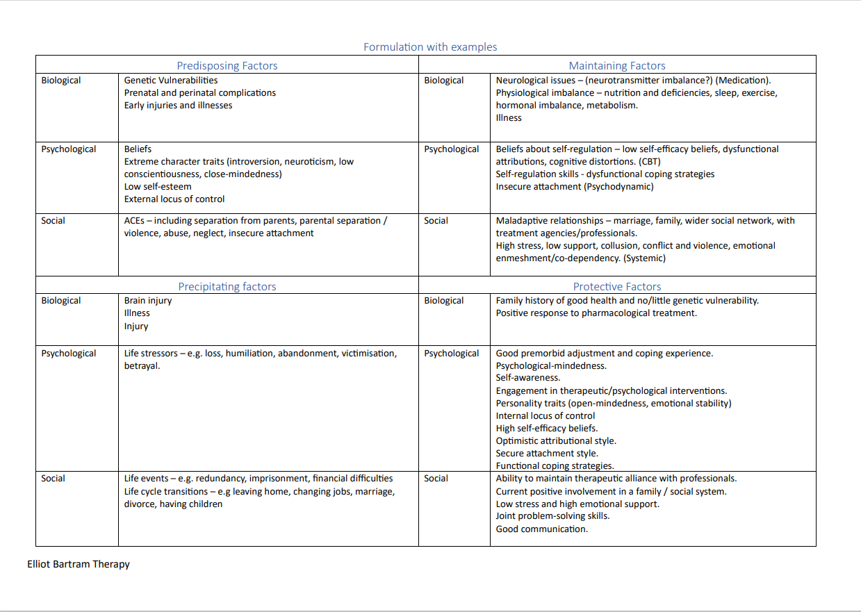 Formulation is a very useful aspect of psychotherapy. It involves working through with clients their complete histories, in order to map out factors that might contribute to their presenting issue.